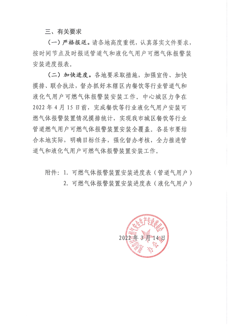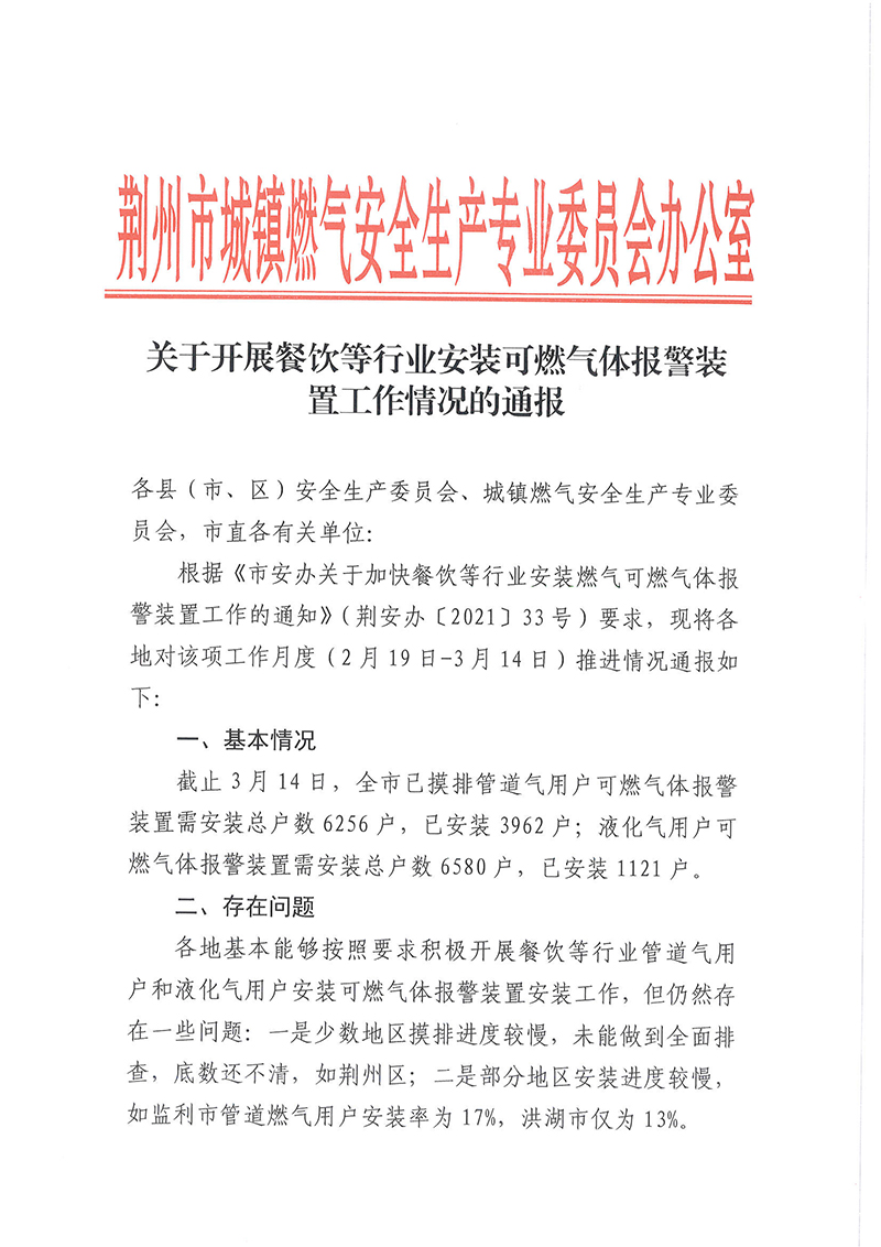 关于开展餐饮等行业安装可燃气体报警装置工作情况的通报