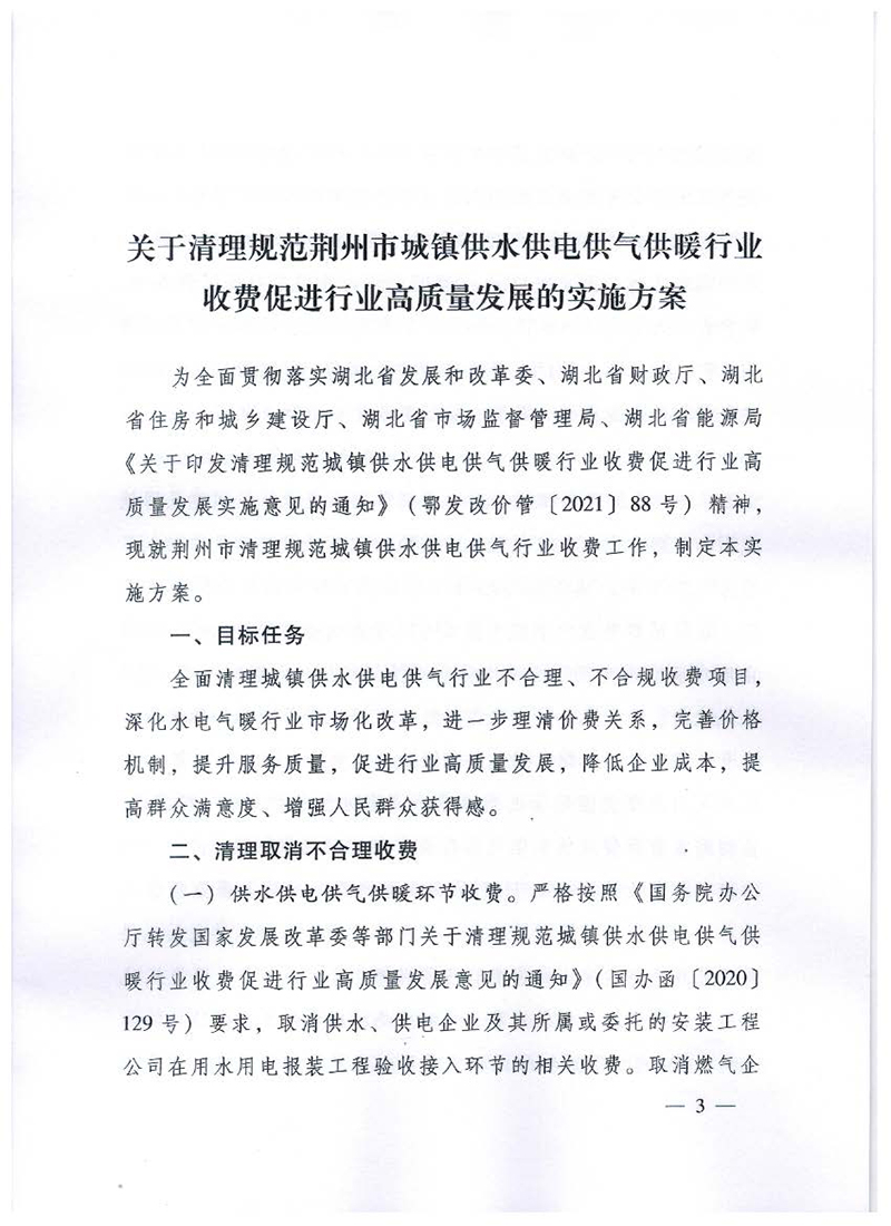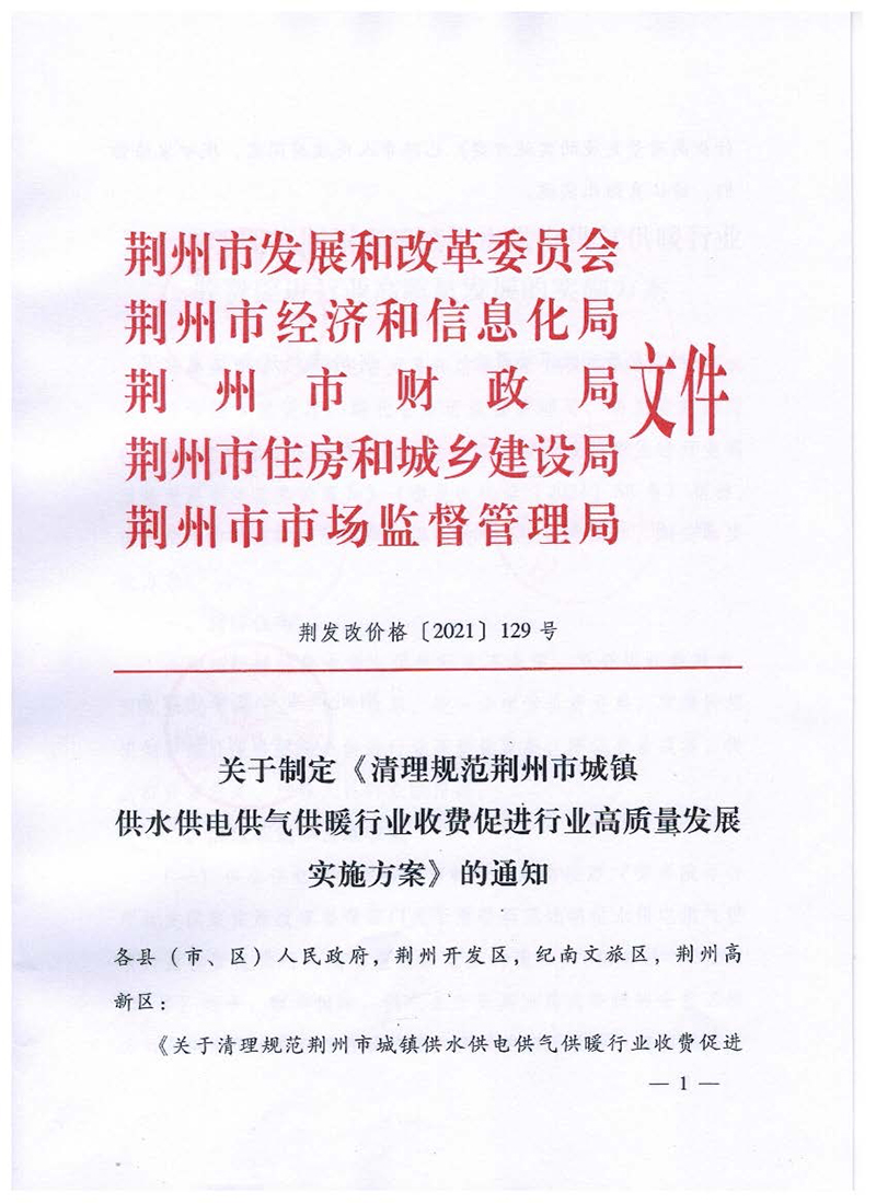 荆发改价格[2021]129号 关于制定《清理规范荆州市城镇供水供电供气供暖行业收费促进行业高质量发展实施方案》的通知